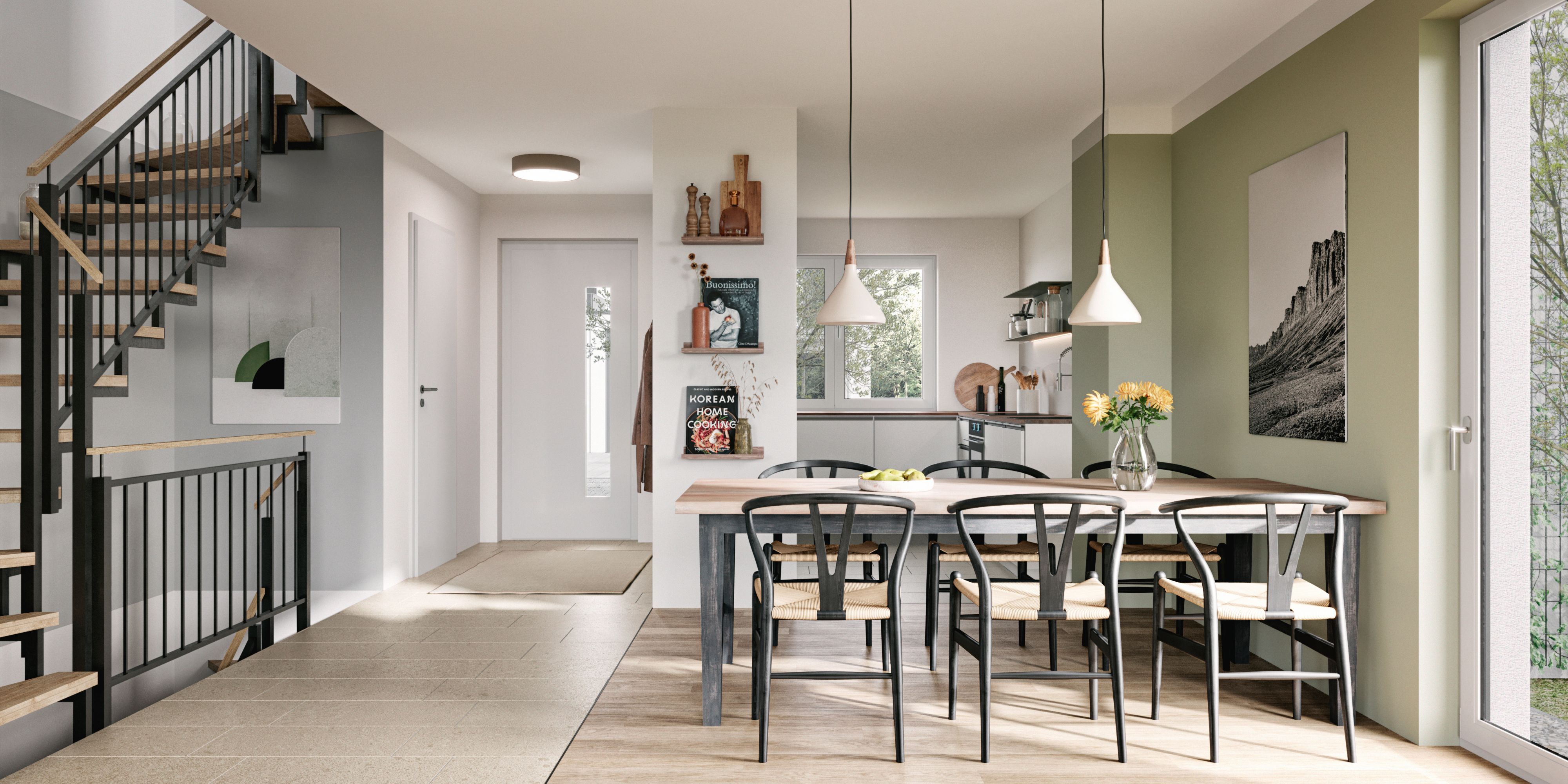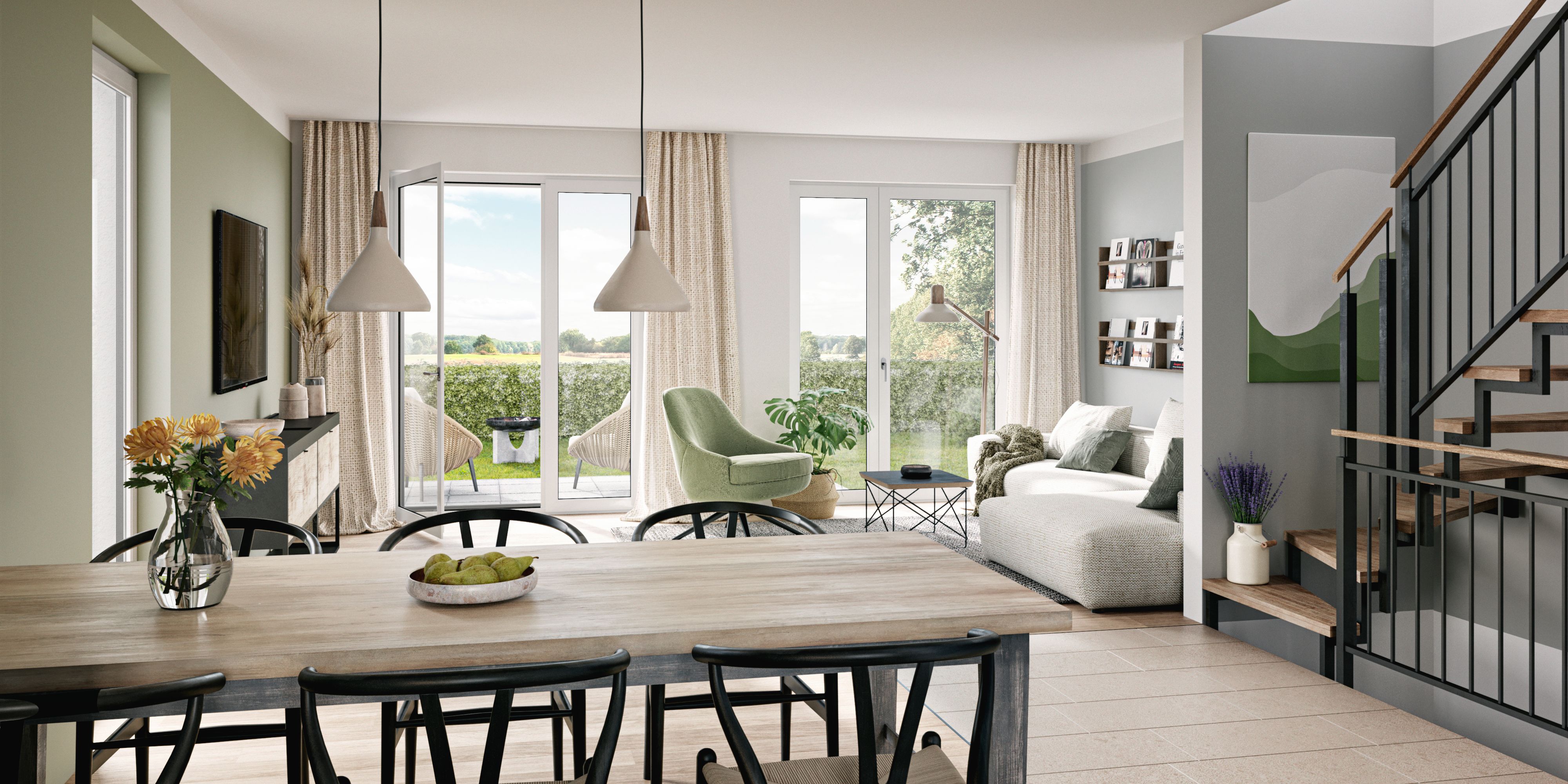 Die Häuser von Bergfeld Living 2 sind modern, großzügig geschnitten und komfortabel. Auf rund 120 m² Wohnfläche verteilen sich drei Ebenen mit viel Platz für Familie, Gäste, Arbeit und Hobbys. Große Fensterflächen lassen Licht und Sonne ins Haus und schaffen eine helle, freundliche Atmosphäre.